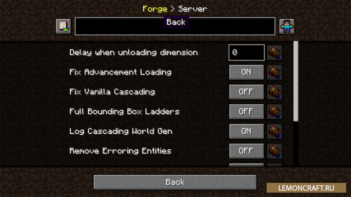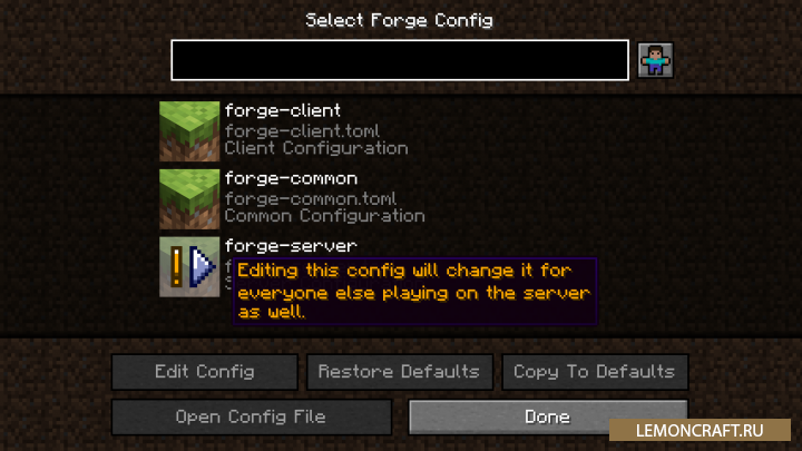 Мод на меню конфигурации для Forge Config Menus for Forge добавляет в игру возможность вносить изменения в конфигурационные файлы не отвлекаясь от игры. Теперь вам нет необходимости искать нужную папку и редактировать файлы в ней, все можно сделать прямо в процессе игры. Данный мод так же позволяет конфигурировать сервер.